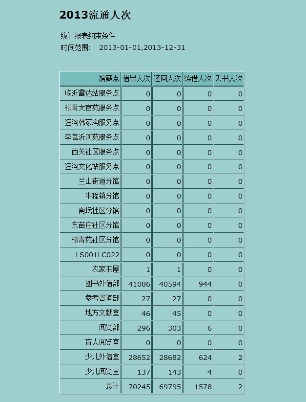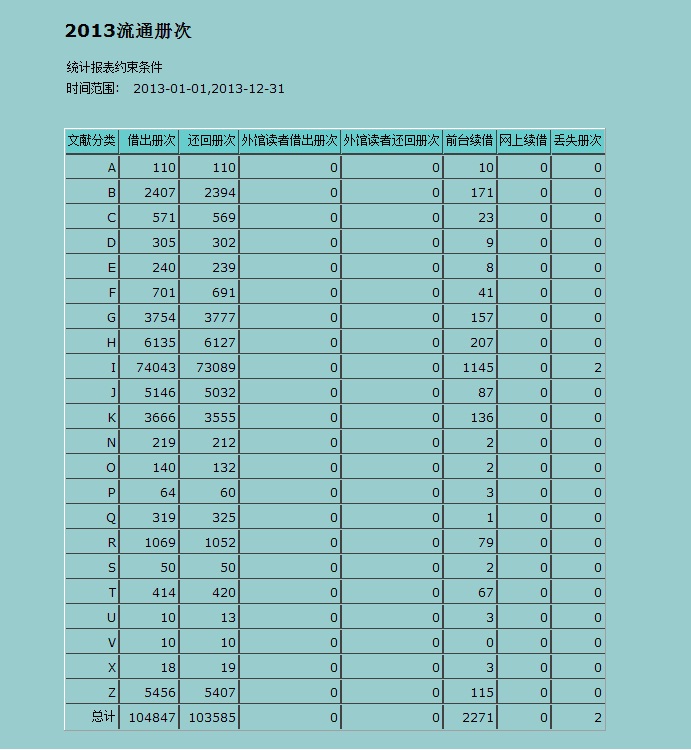 2013年普通文献外借量为107118册,未纳入系统馆外流动服务点文献借阅量为10031册,共 117149册。