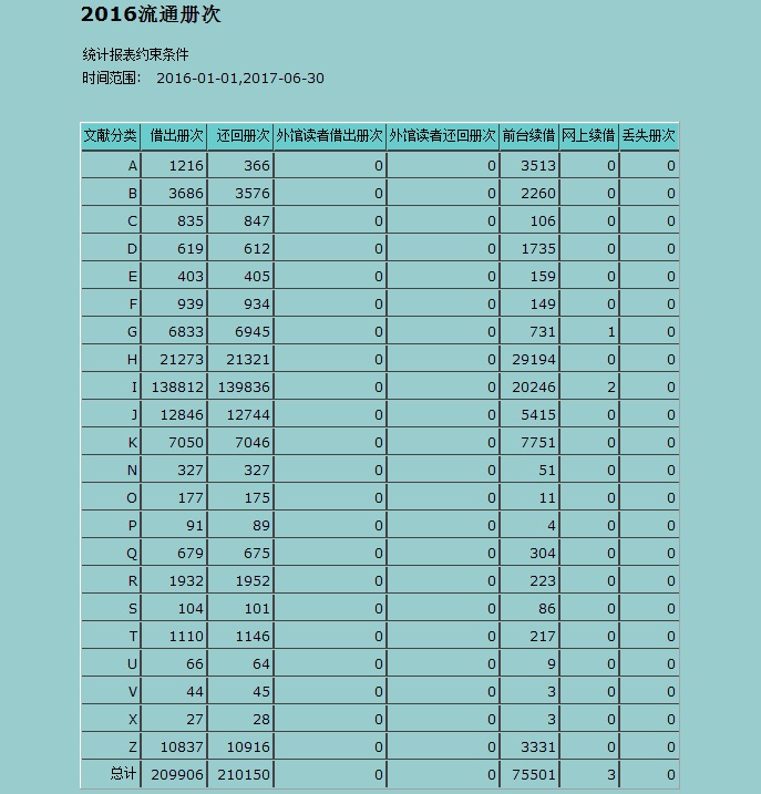 2016年普通文献外借量为285407册,未纳入系统馆外流动服务点文献借阅量为10007册,共 295414册。