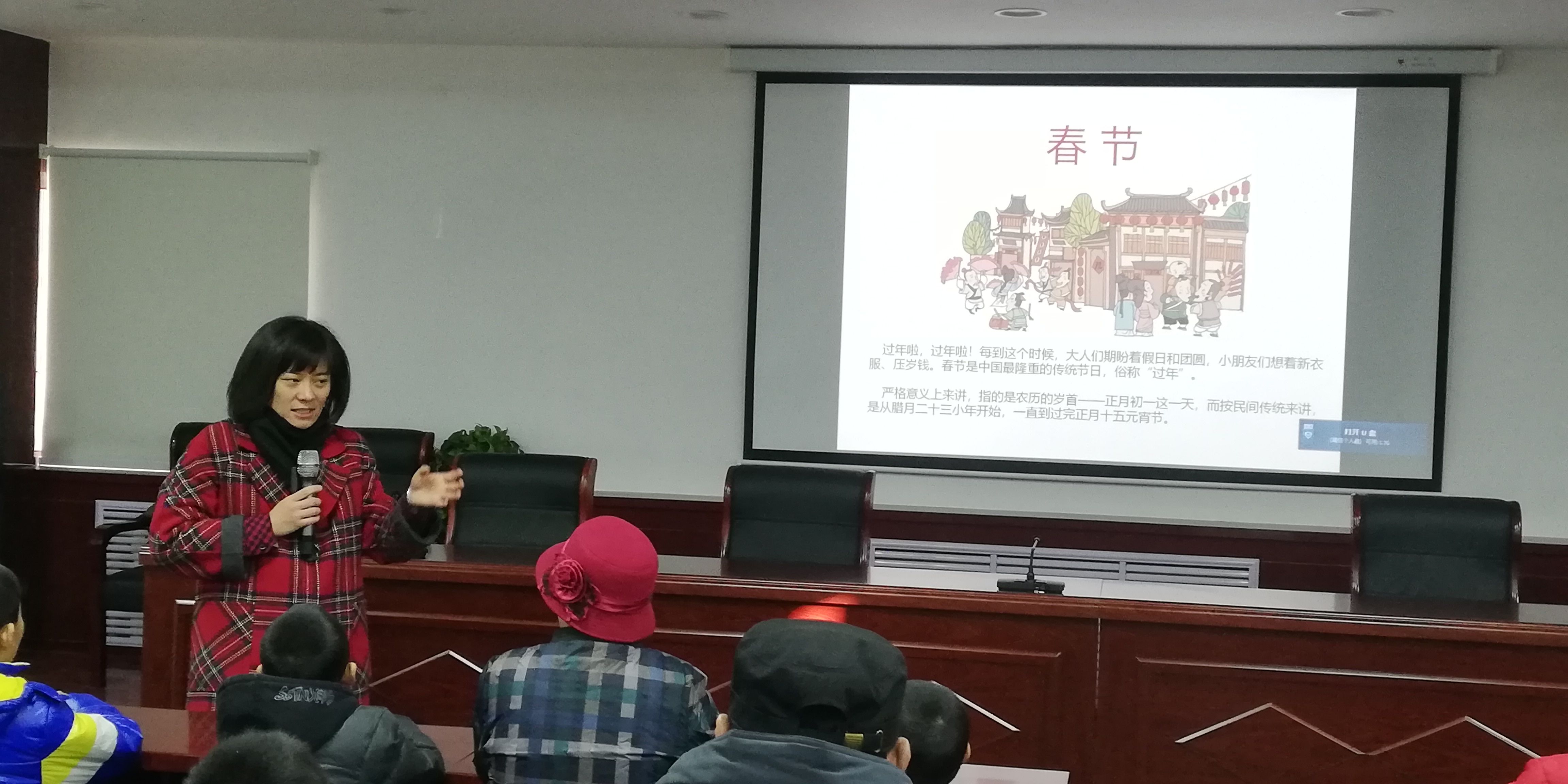 蔺佳老师首先讲了春节的由来,她深入浅出的道出了春节的来历、含义和年俗、一个“年兽”的传说让在场的听众们听得津津有味;一首北宋王安石的古诗《元日》画龙点睛,道出了年俗精粹。讲座通过简明扼要指出中国历法《太阳历》、《颛顼历》与春节的关系,重点介绍了春节包饺子、吃汤圆、祭财神、祭祖先、扫年货、戴“人胜”、备耕耘、搭灯棚、放生等传统,引导现代人反思——在欢乐喜庆过春节的同时,要有家国情怀和人生的深刻追求;要懂得祈福、心存敬仰;要振奋精神、辛勤劳作,年终才有收获。
