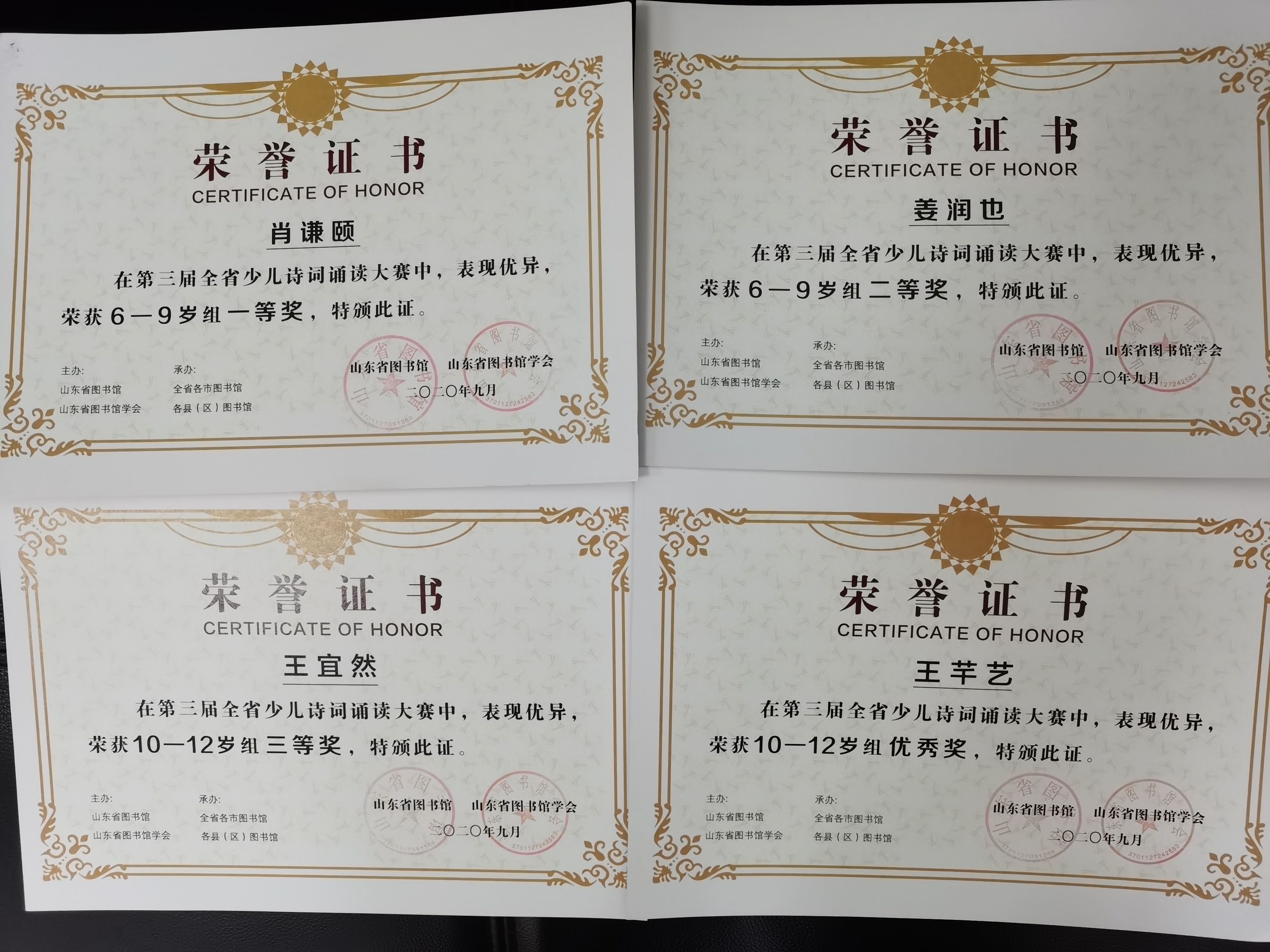 活动自今年9月份启动以来,兰山区图书馆积极参与辖区内各学校开展海选的同时,在馆内也组织经开赛区的选拔。最终,全区共有70名少儿选手入围临沂市复赛,14名选手参与山东省决赛。经过省决赛的激烈角逐,来自我区肖谦颐小选手获得一等奖,姜润也小选手获得二等奖,王宜然小选手获得三等奖,王芊艺、周弘旭、张子涵等11名小选手荣获优秀奖。兰山区图书馆也因为在此次活动的积极组织、认真筹备被省图书馆授予“全省少儿诗词诵读大赛先进集体”荣誉称号。