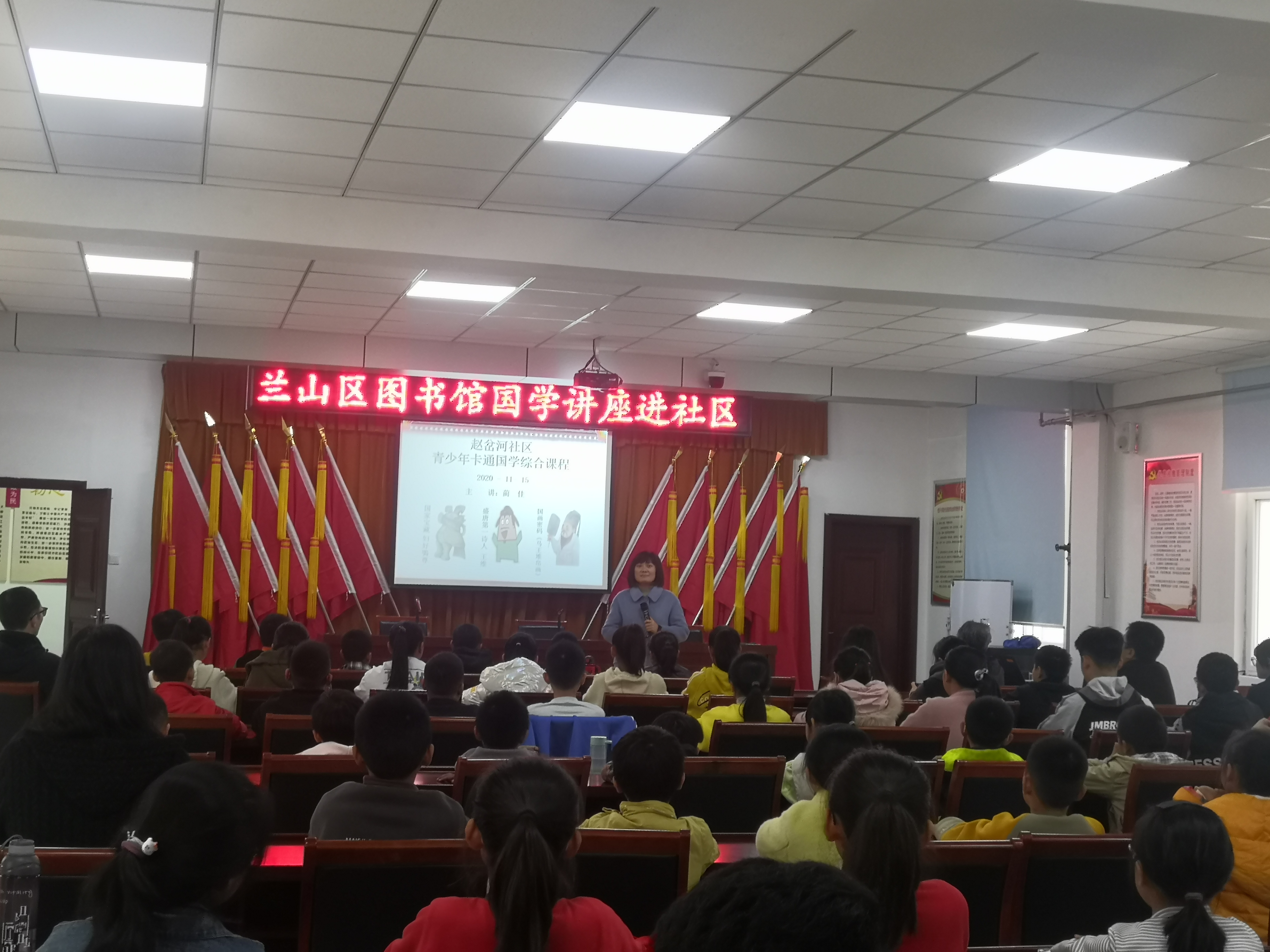 为进一步传承国学经典,丰富社区少年儿童文化生活,11月14日,兰山区图书馆国学讲堂进社区活动来到柳青街道赵岔河社区。活动邀请市民大讲堂特约嘉宾、全国“中华之星国学大赛”特级辅导教师蔺佳老师,为社区的家长和小朋友们带来的国学亲子课堂:盛唐第一诗人—“诗佛”王维、国家宝藏—妇好鴞尊和国华密码—马王堆帛画。精彩的内容、生动活泼的授课方式吸引社区60余名青少年儿童参加。