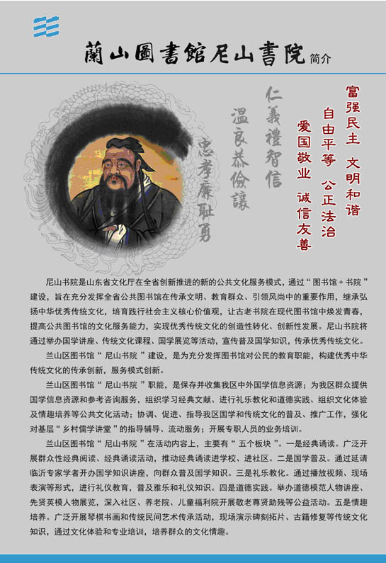 兰山区图书馆“尼山书院”建设,是为充分发挥图书馆对公民的教育职能,构建优秀中华传统文化的传承创新,服务模式创新。
